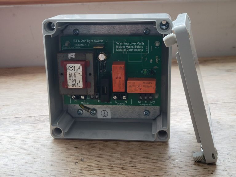 Our Bluetooth Mains 2 Channel Switch uses long range class 1 Bluetooth technology to talk to your Smart Phone.